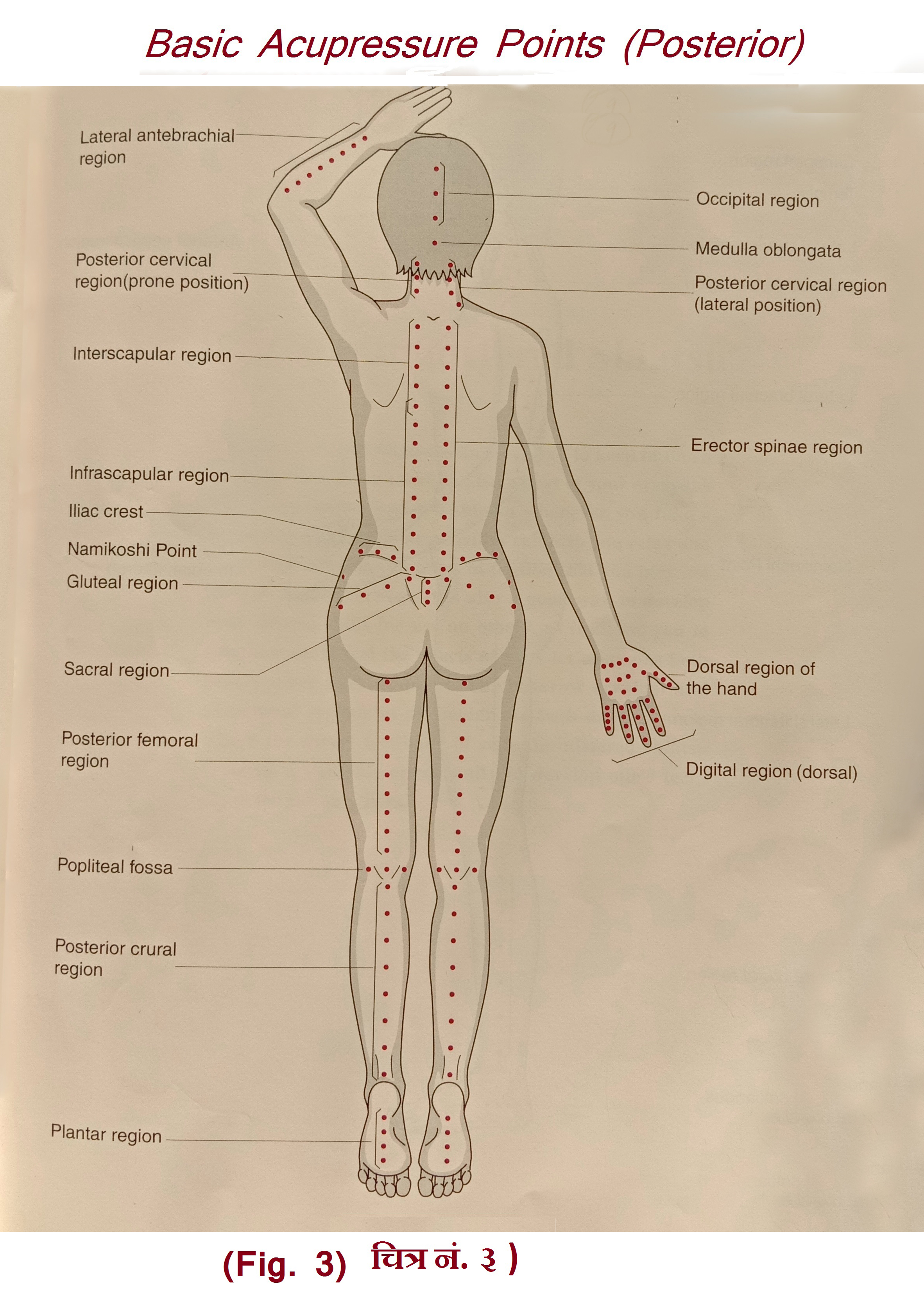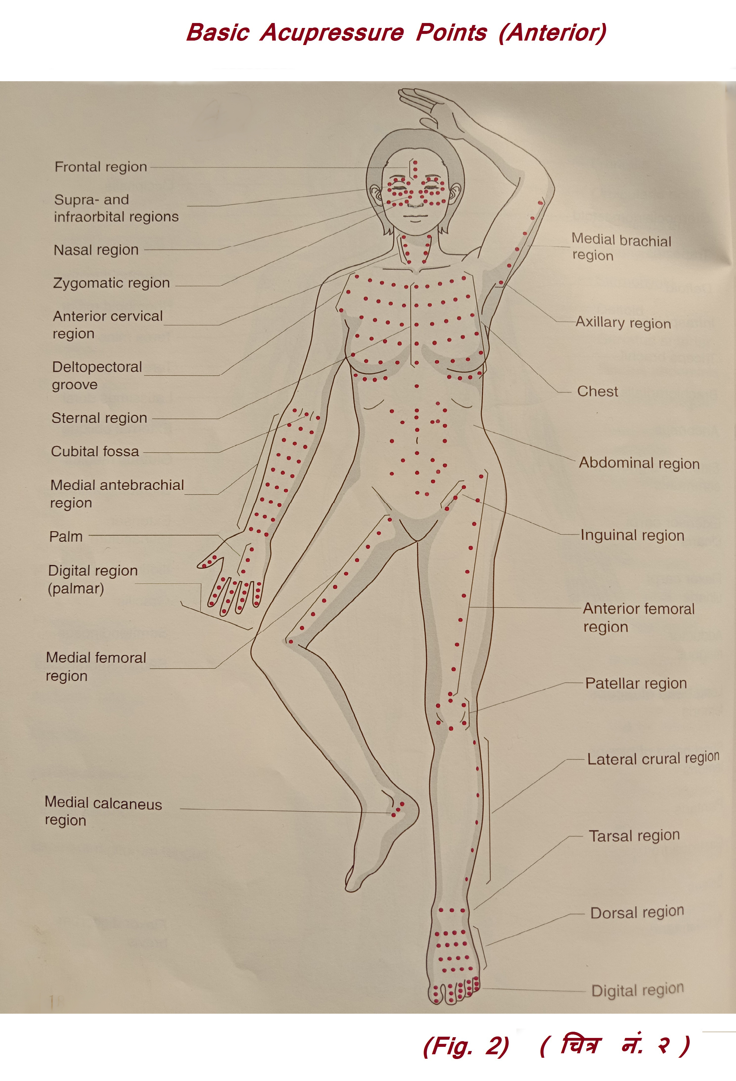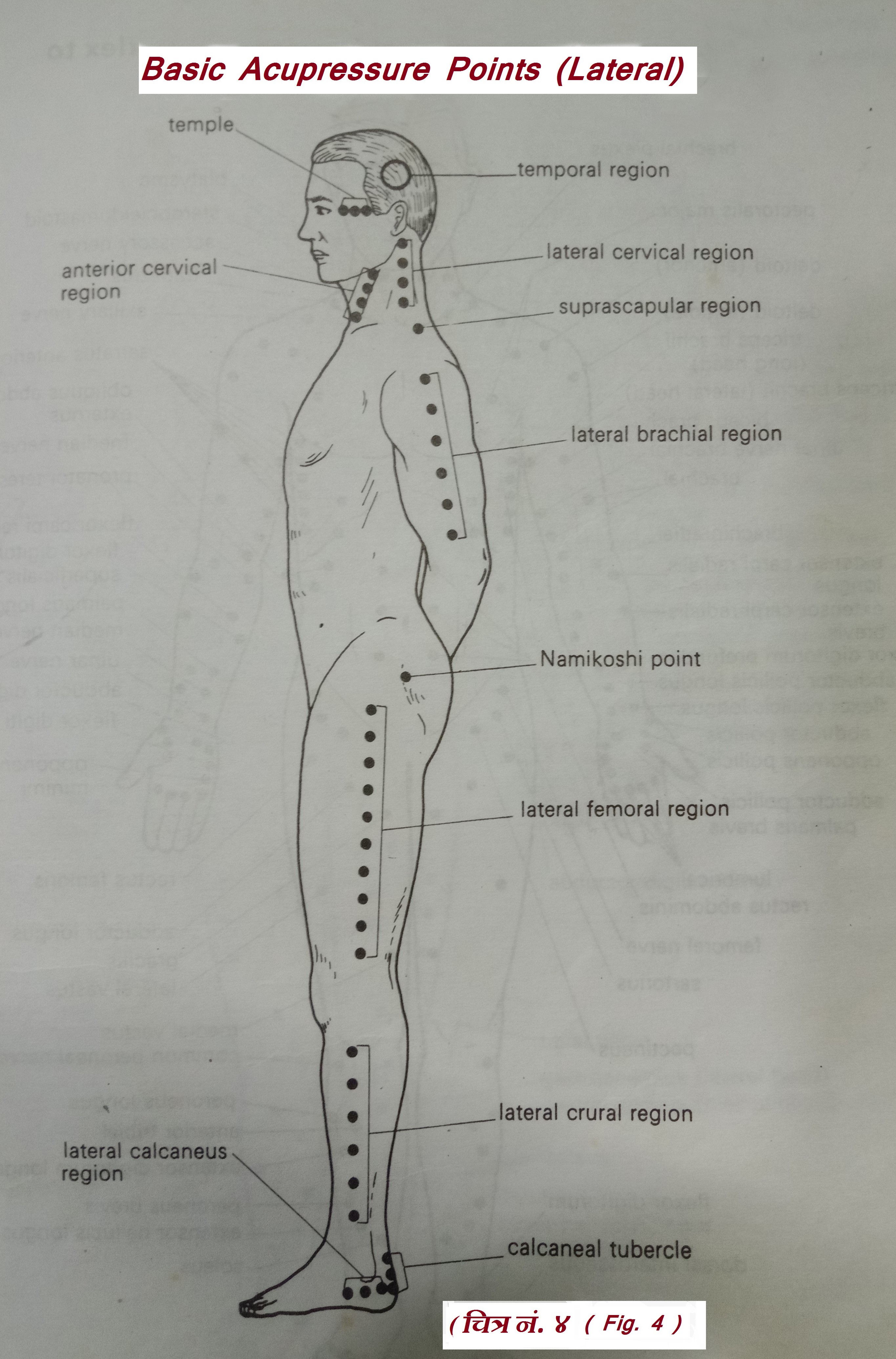 अक्युपन्चर अथवा अक्यूप्रेसर उपचार पद्दति अनुसार हाम्रो शरीरमा हुने मेरिडियनहरुमा झन्डै ९०० वटा जति ‘अक्यू’ विन्दुहरू हुन्छन् (चित्र १.) | रोग निको बनाउन यी विन्दुहरुमा की त घोचिन्छ या दबाब दिइन्छ | केही महत्वपूर्ण विन्दुहरू चित्र न. २, ३ र ४ मा दिइएका छन् |